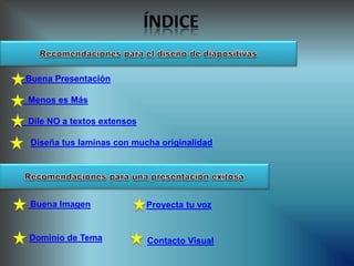 El documento ofrece consejos para realizar presentaciones exitosas, incluyendo diseñar diapositivas con fondos simples y texto breve, vestir de manera apropiada, practicar el tema para dominarlo, proyectar la voz de manera clara y establecer contacto visual con la audiencia.