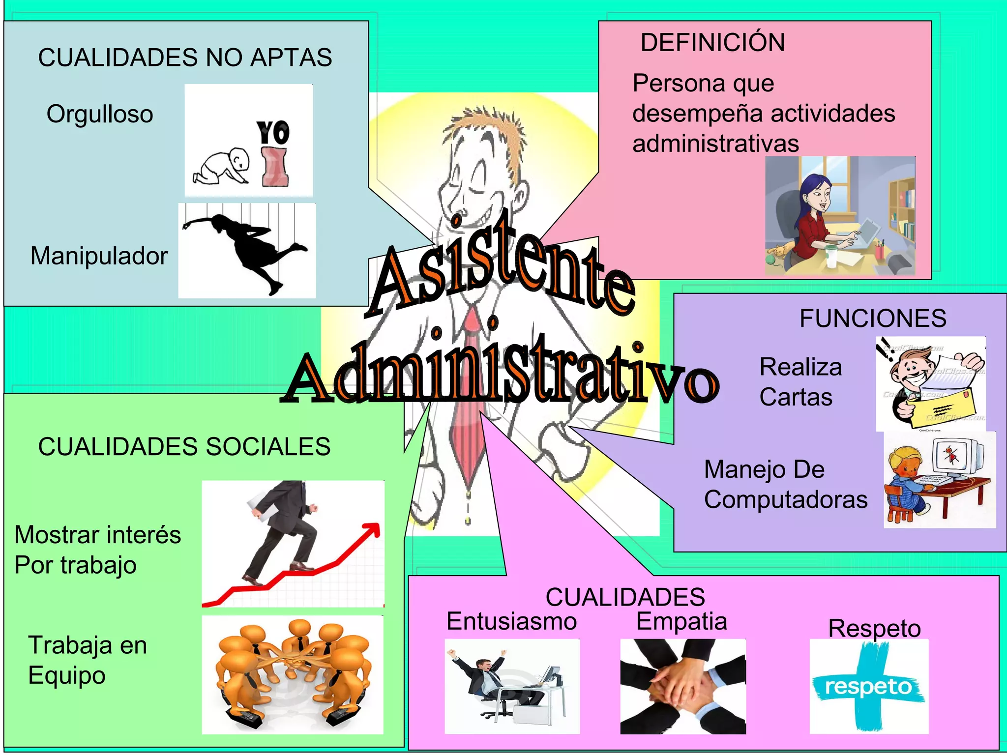 Este documento describe las cualidades y funciones de una persona que desempeña actividades administrativas. Detalla cualidades no aptas como orgulloso y manipulador, mientras que destaca cualidades sociales positivas como mostrar interés por el trabajo, entusiasmo, empatía, respeto y trabajo en equipo. También enumera funciones como realizar cartas y manejo de computadoras.