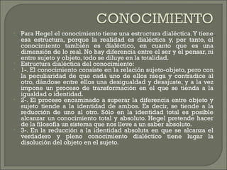 El documento describe la dialéctica de Hegel y cómo se aplica al conocimiento. La dialéctica expresa la contradicción y necesidad de cambio en el mundo a través de tres momentos: la tesis, la antítesis que la niega, y la síntesis que supera la contradicción elevándola a un nivel superior. Para Hegel, el conocimiento tiene esta misma estructura dialéctica porque la realidad es dialéctica, no estática, y está en constante proceso de transformación a través de la contradicción.