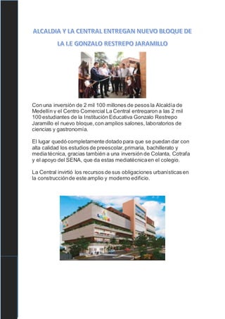 El Centro Comercial La Central y la Alcaldía de Medellín invirtieron 2.1 mil millones de pesos para construir un nuevo bloque en la Institución Educativa Gonzalo Restrepo Jaramillo, con amplios salones, laboratorios y equipamiento para preescolar, primaria, bachillerato y formación técnica, beneficiando a 2100 estudiantes. La inversión permitió dotar completamente la institución educativa con alta calidad.