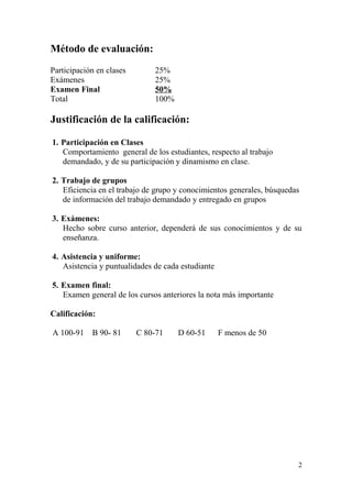 El documento presenta un curso de heladería impartido en el Instituto Superior de Alta Cocina. El curso tiene como objetivos capacitar a los estudiantes en la elaboración de helados y sorbetes siguiendo estándares de calidad, higiene y presentación. A lo largo de 6 semanas, los estudiantes aprenderán recetas internacionales de helados y sorbetes a través de clases teóricas y talleres prácticos, para luego ser evaluados mediante exámenes y su participación.