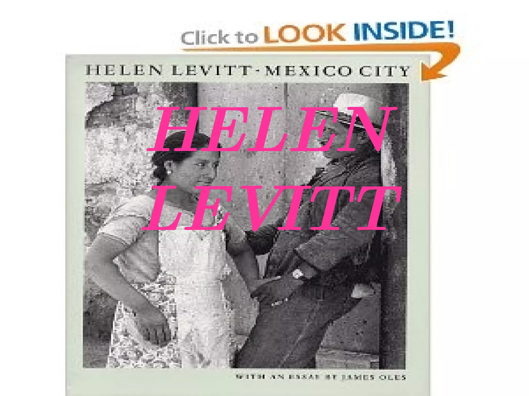 Helen Levitt fue una fotógrafa estadounidense nacida en Nueva York en 1913 que se especializó en retratar las calles y habitantes de la ciudad, especialmente niños, en blanco y negro. Tuvo como maestros a Walker Evans y Henri Cartier-Bresson y fue influenciada por Luis Buñuel en su trabajo documental de finales de los 1940s. Además de su obra más conocida en blanco y negro, también hizo fotografía a color en diapositivas en las últimas décadas de su vida, centrándose principal