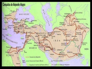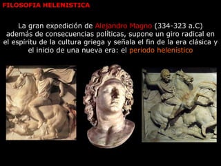 Este documento describe el período helenístico-romano de la filosofía. La expedición de Alejandro Magno marcó el fin de la era clásica griega y el inicio de una nueva era cosmopolita y helenística. Escuelas como el epicureísmo, el estoicismo y el escepticismo surgieron en este período para abordar cuestiones éticas en el nuevo contexto social. Alejandría se convirtió en un importante centro cultural con la biblioteca y el museo, que contribuyeron al desarrollo de la ciencia