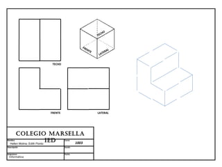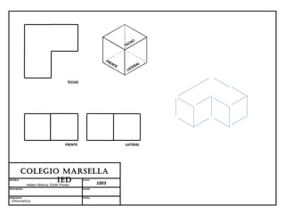 El documento presenta los planos de una estructura de un colegio que incluye el frente, lateral y techo con las dimensiones y detalles de cada parte. Los planos fueron diseñados por las estudiantes Hellen Molina y Edith Flórez para su clase de Informática del colegio MARSellA.