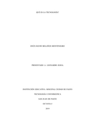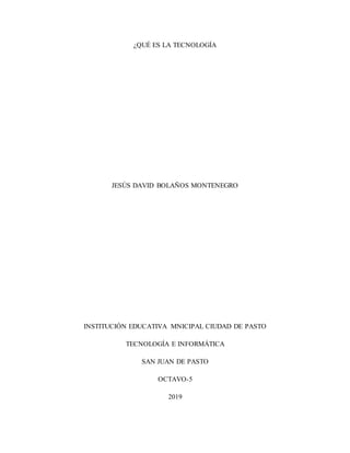 Este documento define la tecnología y explica su proceso. La tecnología se refiere a los objetos creados por los humanos para satisfacer necesidades como alimentación, vestido y comunicación. El proceso tecnológico implica identificar un problema, investigar soluciones, diseñar una solución, planificar su construcción y probar el resultado. La tecnología requiere de imaginación, conocimientos científicos, materiales apropiados y habilidades técnicas.