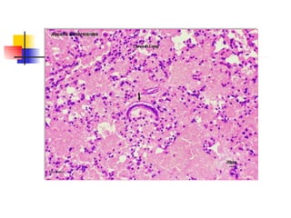 Los helmintos son parásitos intestinales que incluyen nematodos como Ascaris lumbricoides. A. lumbricoides es el nematodo intestinal más grande que causa ascariasis, una enfermedad común en zonas cálidas y húmedas. Los síntomas incluyen dolor abdominal, vómitos y diarrea. El ciclo de vida del parásito implica la ingestión de huevos que eclosionan en larvas en los pulmones e intestinos, causando daño antes de madurar e infectar a otros huéspedes. El diagnóstico se