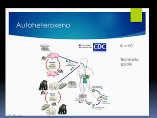 Este documento proporciona información sobre diferentes parásitos médicos. Describe la epidemiología, morfología, ciclo de vida y manifestaciones clínicas de Ascaris lumbricoides, Trichuris trichiura y Enterobius vermicularis. Incluye detalles sobre el agente etiológico, distribución, reservorio, modo de transmisión, periodo prepatente, manifestaciones y tratamiento de cada parásito.