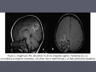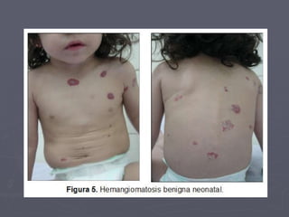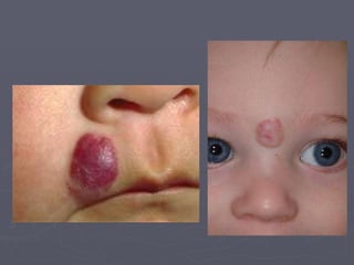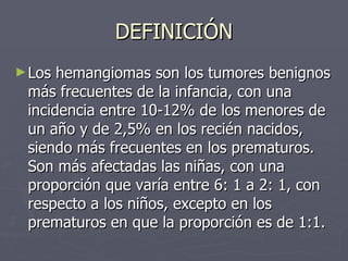 Este documento describe los hemangiomas, tumores benignos vasculares comunes en la infancia. Los hemangiomas son lesiones caracterizadas por un período de crecimiento rápido seguido de estabilización e involución espontánea. Pueden ubicarse en la piel superficial o profunda, y los sitios más comunes son la cabeza, cuello y tronco. Aunque la mayoría son únicos, entre un 15-30% de los niños pueden presentar lesiones múltiples.