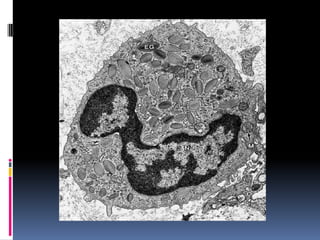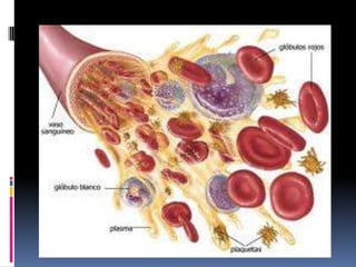 El documento describe la sangre y sus componentes principales. En pocas oraciones, la sangre circula por el cuerpo transportando oxígeno, nutrientes y desechos, y contiene glóbulos rojos, glóbulos blancos y plaquetas en un líquido llamado plasma. Estos componentes tienen funciones importantes como el transporte de oxígeno y dióxido de carbono, la protección contra infecciones, y la coagulación de la sangre.