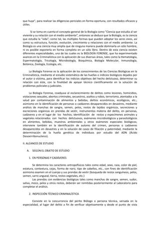Este documento presenta una introducción a la criminalística y la biología forense. Explica que la criminalística aplica el conocimiento científico para descubrir evidencia relacionada con crímenes. Luego, define la biología forense como el estudio de huellas biológicas encontradas en escenas de crímenes para identificar a víctimas, sospechosos y circunstancias. Finalmente, detalla los diferentes tipos de evidencia biológica que puede analizarse, como sangre, semen y pelos,