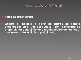 Este documento trata sobre la hematología forense. Explica que la sangre es un líquido rojo que circula por el cuerpo y tiene características individuales. Describe las ramas reconstructora e identificadora de la hematología forense, las cuales estudian manchas de sangre para reconstruir eventos o identificar a personas. También detalla los procedimientos para examinar y recolectar muestras de sangre en una escena del crimen.