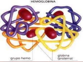 La hemoglobina es una proteína contenida en los eritrocitos que transporta oxígeno en la sangre. Está compuesta de una parte proteica llamada globina y un grupo no proteico llamado hem que contiene hierro y da el color rojo a la sangre. Existen diferentes tipos de hemoglobina dependiendo de las cadenas de globina presentes, siendo la hemoglobina A la más común en adultos. Su principal función es el transporte de oxígeno de los pulmones a los tejidos y de dióxido de carbono de los tejidos a los pul
