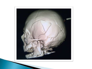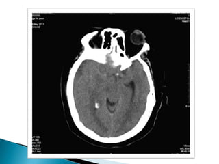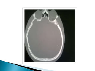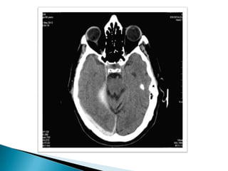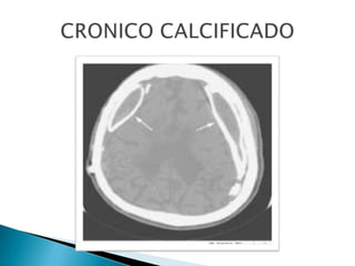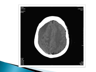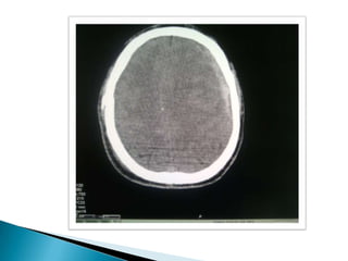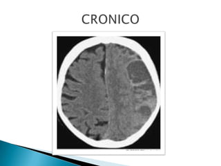 Este documento resume el caso de un paciente masculino de 33 años que ingresó al hospital con un traumatismo craneoencefálico grave luego de una caída de un tercer piso. Presentaba una hemorragia subdural e hiperdensidades en el cerebro. Fue sometido a una craneotomía descompresiva pero su condición se deterioró y falleció 25 horas después.