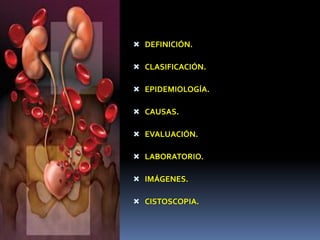 Este documento trata sobre el enfoque del paciente con hematuria. Define hematuria, clasifica los tipos de hematuria y discute la epidemiología, causas comunes, evaluación inicial incluyendo exámenes de laboratorio e imágenes, y cistoscopia. El objetivo es identificar la causa subyacente de la hematuria y descartar enfermedad maligna.