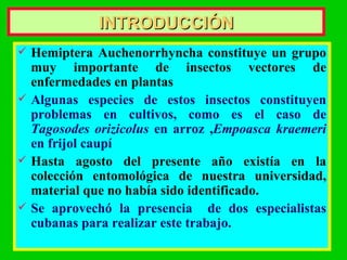 Este documento presenta los resultados del estudio de las especies de Hemiptera Auchenorrhyncha presentes en la colección entomológica de la Universidad Nacional de Tumbes en Perú. Se identificaron 42 especies pertenecientes a 13 familias. Las familias con mayor número de especies fueron Cicadellidae y Delphacidae. Las especies más comunes fueron Hortensia similis, Exitianus spp. y Empoasca kraemeri para Cicadellidae, y Tagosodes orizicolus y Peregrinus maidis para Delphac