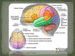 Los hemisferios cerebrales están separados por la cisura longitudinal del cerebro y conectados por el cuerpo calloso. Cada hemisferio se divide en lóbulos frontales, parietales, temporales y occipitales separados por surcos. La corteza cerebral recubre los hemisferios y contiene aproximadamente 10 mil millones de neuronas organizadas en seis capas.