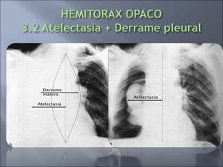 Este documento describe diferentes patologías que pueden causar un hemitórax opaco, incluyendo atelectasia, derrame pleural, cáncer de pulmón y mesotelioma. La causa más frecuente de hemitórax opaco es la atelectasia obstructiva causada por cáncer bronquial u otro cuerpo extraño obstructivo. El cáncer de pulmón también puede causar hemitórax opaco a través de atelectasia y derrame pleural asociado.