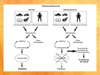 La homocistinuria es un trastorno congénito del metabolismo de la homocisteína causado por un defecto enzimático que causa niveles elevados de homocisteína en la sangre y orina. Sus principales síntomas incluyen retraso mental, fracturas óseas, problemas oculares y arterosclerosis prematura. El tratamiento consiste en una dieta baja en metionina y suplementos de vitaminas B para reducir los niveles de homocisteína y prevenir complicaciones.