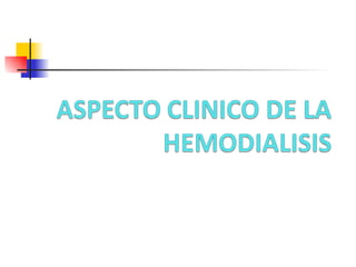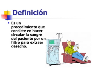 Este documento proporciona información sobre la hemodiálisis y la diálisis peritoneal. Define la hemodiálisis como un procedimiento que hace circular la sangre del paciente a través de un filtro para extraer desechos. Describe los tipos de acceso vascular, las complicaciones y los aspectos técnicos de la hemodiálisis. También explica el equipo, los líquidos de diálisis y el proceso de la diálisis peritoneal.