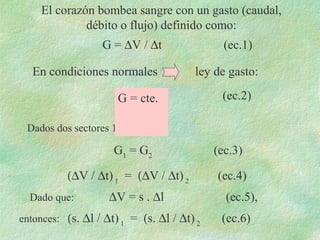 El documento describe el sistema cardiovascular y los conceptos relacionados con la circulación de la sangre. Explica que el corazón bombea la sangre a través de los vasos sanguíneos a un gasto constante, y que la sangre pierde energía debido a la fricción en los vasos. También presenta ecuaciones matemáticas que relacionan el gasto sanguíneo, la presión, la resistencia y otros factores.