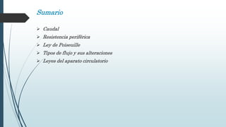 El documento trata sobre la hemodinámica cardiovascular, enfocándose en el movimiento de la sangre y las relaciones entre presión, resistencia y flujo sanguíneo. Se explican los componentes del aparato circulatorio, así como diferentes tipos de flujo y sus características, incluyendo el flujo laminar y turbulento. Además, se discuten principios físicos como la ley de Poiseuille y el teorema de Bernoulli que rigen el comportamiento del flujo sanguíneo.