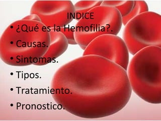 La hemofilia es una enfermedad hereditaria ligada al sexo que causa sangrado prolongado debido a la deficiencia de factores de coagulación como el factor VIII o IX. Existen tres tipos principales de hemofilia que varían en el factor deficiente. El tratamiento actual implica reemplazar el factor faltante mediante infusiones intravenosas, aunque se investiga la terapia génica como posible cura.
