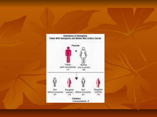 La hemofilia es una enfermedad genética ligada al cromosoma X que causa dificultad en la coagulación de la sangre debido a la deficiencia de factores de coagulación como el factor VIII o IX. Se caracteriza por hemorragias internas y externas. Es hereditaria y se transmite de madres portadoras a hijos. El tratamiento consiste en reemplazar los factores de coagulación deficientes mediante infusiones intravenosas para prevenir y controlar hemorragias.