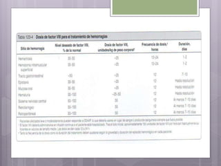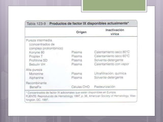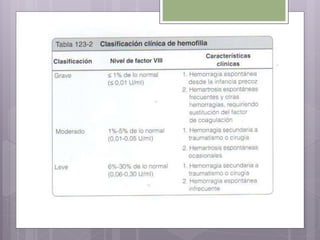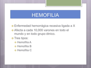 Este documento resume los tres tipos principales de hemofilia: hemofilia A, hemofilia B y hemofilia C. La hemofilia A es la más común y se debe a defectos en el factor VIII. La hemofilia B se debe a defectos en el factor IX. La hemofilia C implica defectos en el factor XI. Todas conducen a un sangrado prolongado debido a defectos en la cascada de coagulación de la sangre. Se describen las características genéticas, clínicas y de tratamiento de cada tipo.