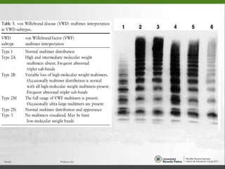 Este documento resume diferentes trastornos de la coagulación hereditarios como la hemofilia A, hemofilia B y la enfermedad de von Willebrand. Describe las características clínicas, el diagnóstico y el tratamiento de cada uno. Explica que la hemofilia A y B se deben a deficiencias del factor VIII y IX respectivamente, mientras que la enfermedad de von Willebrand involucra defectos en la proteína von Willebrand.