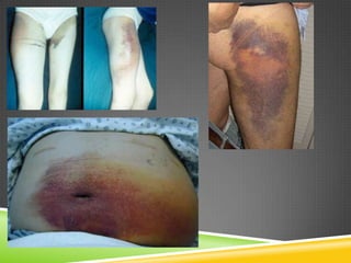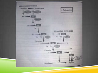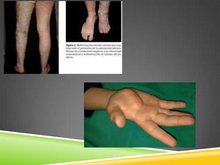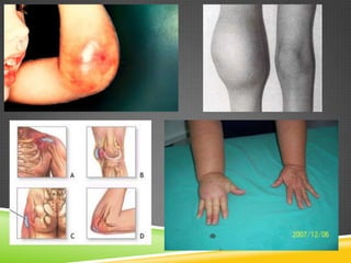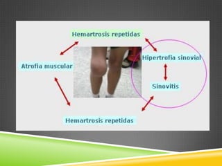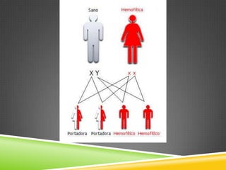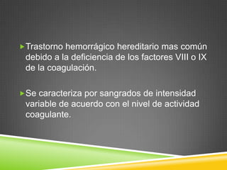 Este documento describe la hemofilia tipo A y B, trastornos hemorrágicos hereditarios causados por la deficiencia de los factores VIII o IX de la coagulación. Se transmite ligado al cromosoma X y solo se manifiesta en varones. Incluye información sobre la frecuencia, características, diagnóstico, manifestaciones clínicas, tratamiento y complicaciones. También cubre temas como la herencia ligada al cromosoma X, diagnóstico de portadoras, prenatal y preimplantación.