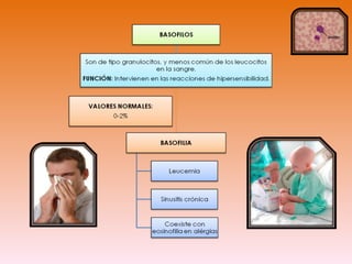 El documento proporciona información sobre el hemograma y sus componentes. Explica que el hemograma estudia de forma cualitativa y cuantitativa los elementos figurados de la sangre, incluyendo glóbulos rojos, plaquetas y glóbulos blancos. Además, detalla los pasos para realizar un hemograma, los índices eritrocitarios que proporciona como el volumen corpuscular medio, la concentración de hemoglobina corpuscular media y la hemoglobina corpuscular media. Finalmente, ofrece ejemplos de cómo interpretar los resultados