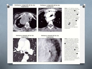 Este documento describe varios conceptos relacionados con la radiología torácica. Define hemoptisis, grados de hemoptisis, diagnósticos diferenciales comunes de hemoptisis como cáncer broncogénico y tuberculosis. También describe sibilancias, tos, disnea, dolor torácico, neumotórax y estridor y sus causas más frecuentes.