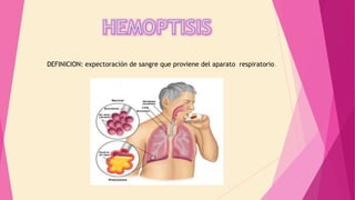 Este documento describe los motivos de consulta relacionados con el aparato respiratorio como la hemoptisis y la disnea. Define la hemoptisis como la expectoración de sangre proveniente del sistema respiratorio y describe los síntomas, causas comunes como la tuberculosis y el tratamiento. También define la disnea como una sensación desagradable y dificultosa de la respiración, y analiza sus causas, grados de gravedad, exámenes y tratamiento.