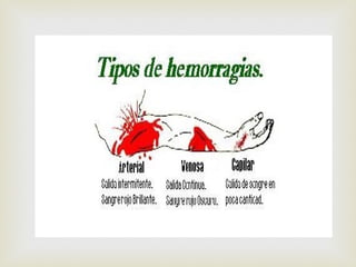 Este documento describe los diferentes tipos de hemorragias según su origen y clasificación. Las hemorragias pueden ser internas, externas u originadas a través de orificios naturales, y pueden provenir de venas, arterias o capilares. Las hemorragias no tratadas pueden ocasionar la muerte debido a la pérdida de sangre, por lo que es importante saber cómo controlarlas.