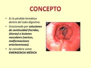 La hemorragia digestiva es la pérdida de sangre dentro del tubo digestivo, causada por úlceras, heridas o lesiones vasculares. Se considera una emergencia médica que requiere evaluación inmediata para determinar la ubicación, visibilidad y gravedad de la hemorragia, así como el tratamiento con fluidos intravenosos, inhibidores de bomba de protones y endoscopia para detener el sangrado.