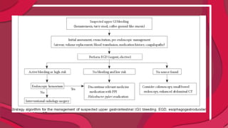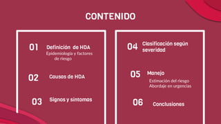 La hemorragia digestiva alta (HDA) es una condición médica grave que se caracteriza por sangrado en el esófago, estómago o duodeno, comúnmente causado por úlceras pépticas y factores de riesgo como la edad avanzada y el uso de ciertos medicamentos. Su manejo incluye estabilización hemodinámica, evaluación de riesgos y endoscopia urgente para identificar y tratar la causa del sangrado. Es crucial tratar las alteraciones hemodinámicas de forma inmediata, y la endoscopia es una herramienta clave en el diagnóstico y tratamiento de HDA.