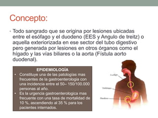 Este documento trata sobre la hemorragia digestiva alta. Define la hemorragia digestiva alta como cualquier sangrado que se origina entre el esófago y el duodeno. Explica que es una de las patologías más frecuentes en gastroenterología con una incidencia de 50-150 personas por 100,000 al año y una tasa de mortalidad de hasta el 35% para pacientes internados. Detalla los principales hallazgos clínicos, factores de riesgo, etiologías y el manejo inicial que incluye la colocación de sonda nasogá