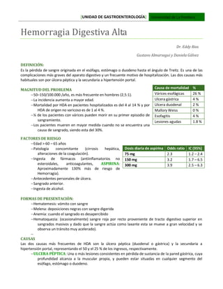 La hemorragia digestiva alta es una pérdida de sangre del esófago, estómago o duodeno, siendo comúnmente causada por úlceras pépticas y hipertensión portal. Su incidencia aumenta con la edad y presenta una mortalidad significativa, especialmente en pacientes con várices esofágicas. El diagnóstico y tratamiento incluyen endoscopía, arteriografía y terapia farmacológica, con un enfoque en la estabilización hemodinámica del paciente.