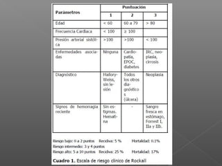 La hemorragia gastrointestinal se refiere a la pérdida de sangre desde el tubo digestivo, y su tratamiento busca estabilizar la hemodinámica y detener la hemorragia. Se clasifica en hemorragia digestiva alta y baja, presentándose de diversas formas como hematemesis, melena y hematoquezia, con mortalidad variando según la edad. El enfoque diagnóstico y terapéutico incluye evaluación clínica, endoscopia, y en casos severos, intervención quirúrgica.
