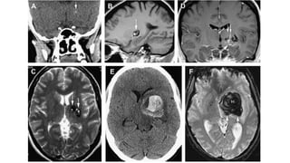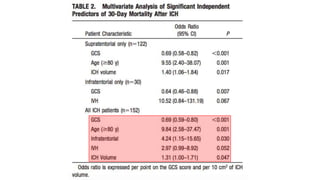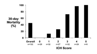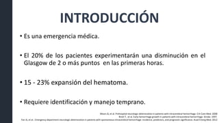 Este documento resume la hemorragia intracerebral (HIC), una emergencia médica grave. La HIC ocurre cuando se forma un coágulo de sangre en el cerebro, generalmente debido a la hipertensión arterial no controlada. Puede causar deterioro neurológico rápido y tiene una alta tasa de mortalidad y morbilidad. Se requiere identificación temprana mediante tomografía computarizada o resonancia magnética para guiar el tratamiento urgente, que puede incluir cirugía. La expansión del hematoma inicial predice un peor