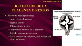 1) La hemorragia posparto es la principal causa de mortalidad materna en el mundo y la segunda en Ecuador. Se define como una pérdida de sangre mayor a 500 ml en un parto vaginal o 1000 ml en un parto por cesárea. 2) Los principales factores de riesgo son la atonía uterina, la retención de tejido placentario y las alteraciones de la coagulación. 3) El tratamiento incluye masaje uterino, medicamentos oxitócicos, taponamiento uterino y en casos graves, embolización arterial o histerectomía.