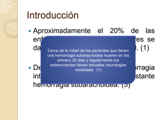 La hemorragia subaracnoidea representa un 20% de las enfermedades cerebrovasculares, con aproximadamente el 50% de los casos siendo aneurismáticos; la mortalidad es alta en los primeros 30 días, y los sobrevivientes suelen tener secuelas neurológicas. Factores de riesgo incluyen tabaquismo, hipertensión, alcoholismo y antecedentes familiares. El diagnóstico se realiza principalmente a través de tomografías y, si es necesario, angiografías para determinar la causa y evaluar complicaciones como el vasoespasmo y la hidrocefalia.