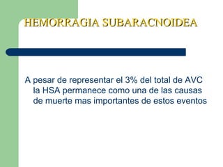 La hemorragia subaracnoidea espontánea representa el 3% de los accidentes cerebrovasculares y es una de las principales causas de muerte por estos eventos. La ruptura de aneurismas cerebrales es responsable del 70-85% de los casos de hemorragia subaracnoidea espontánea. El diagnóstico se realiza mediante tomografía computarizada o punción lumbar, mostrando sangre en el espacio subaracnoideo. El tratamiento consiste en reposo absoluto y control de complicaciones como el resangrado, hidrocefalia o