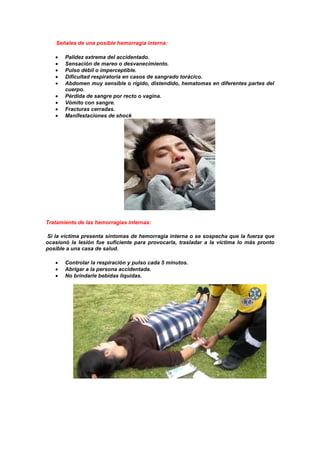 1) La hemorragia es la salida de sangre del sistema cardiovascular provocada por la ruptura de vasos sanguíneos. Puede ser interna o externa. 2) Las hemorragias internas incluyen lesiones graves de vasos dentro del cuerpo que pueden causar shock. 3) Las hemorragias externas ocurren cuando la sangre sale a través de una abertura en la piel, como una herida abierta.
