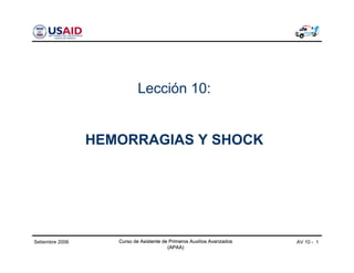 El documento presenta una lección sobre hemorragias y shock de un curso de asistente de primeros auxilios avanzados. La lección cubre objetivos, tipos de hemorragias y su tratamiento, shock y su tratamiento prehospitalario, incluyendo el shock anafiláctico y sus causas.