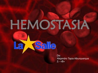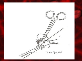 Este documento describe los diferentes tipos de hemostasia, incluyendo la fisiológica y quirúrgica. La hemostasia fisiológica consta de una etapa primaria que involucra la vasoconstricción y la formación del tapón plaquetario, y una etapa secundaria que implica la formación de fibrina. La hemostasia quirúrgica se divide en temporal, que usa métodos mecánicos como la compresión, y definitiva, que emplea ligadura de vasos, transfijación u otros métodos mecánic