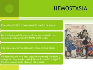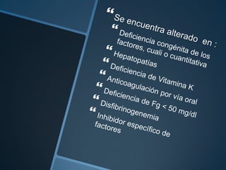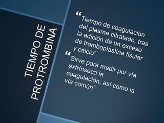 Este documento proporciona información sobre varias pruebas de coagulación sanguínea como el tiempo de tromboplastina, pruebas de función plaquetaria y tiempo de sangrado. Describe los procedimientos, valores normales e interpretación de los resultados de estas pruebas que evalúan la hemostasia y la función plaquetaria.