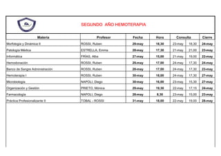 Este documento presenta los horarios de consulta y cierre de las materias del primer, segundo y tercer año de la carrera de Hemoterapia. Se enumeran las materias correspondientes a cada año junto con el nombre del profesor y las fechas y horas de las consultas.