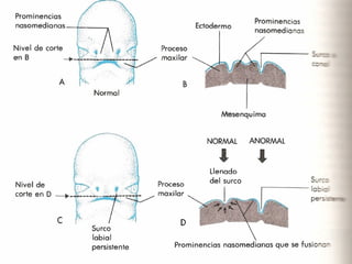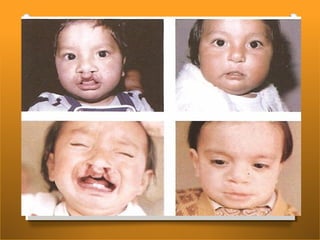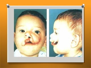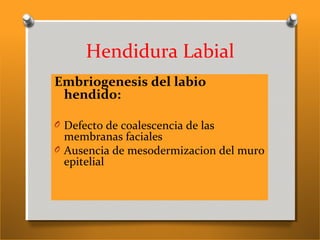 Este documento trata sobre la hendidura labial o labio leporino. Explica que es un defecto de desarrollo que ocurre cuando las membranas faciales no se fusionan correctamente. Luego clasifica los diferentes tipos de hendidura labial y describe las técnicas quirúrgicas más comunes para corregirlas, incluyendo los colgajos cuadrangulares, triangulares y de rotación-avance. Finalmente, discute los factores a considerar al seleccionar la técnica apropiada para cada caso.
