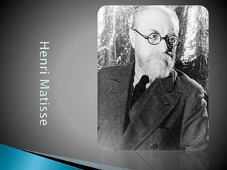 Henri Matisse fue un pintor francés reconocido por su uso del color y su estilo fluido. Se le identificó inicialmente con el fauvismo y destacó por su dominio del lenguaje expresivo del color y el dibujo. Tuvo una larga carrera que abarcó más de medio siglo y lo consagró como una figura central del arte moderno.